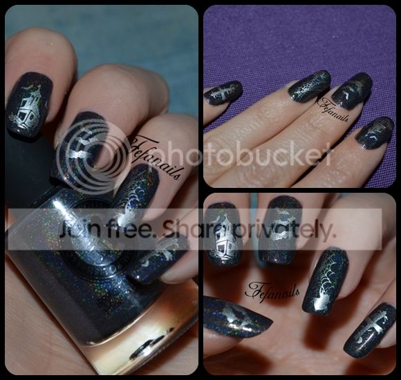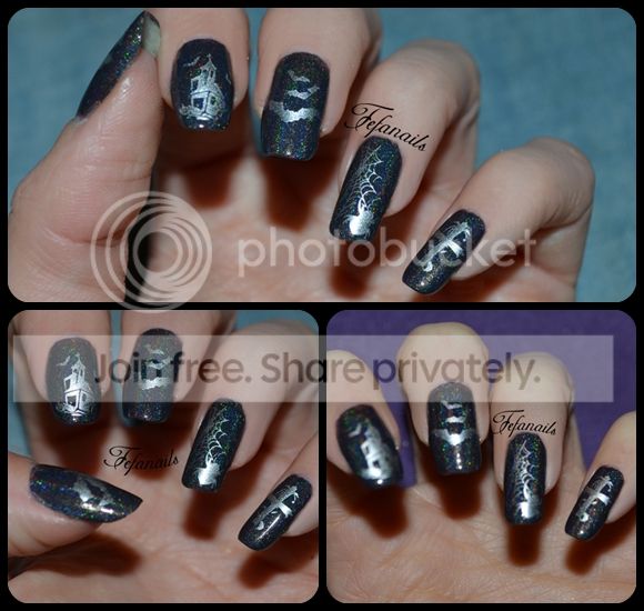 Si je suis toujours aussi volontaire pour allumer le four et concocter mes desserts et autres gourmandises, il faut dire que j’évite de m’exposer trop longtemps aux odeurs de vernis ou de dissolvant. Du coup, pour le bien de bébé, je fais des décos très simples et surtout rapides. C’est pour cela que jusqu’à sa naissance, vous n’allez sûrement pas voir de nail arts très élaborés. D’ailleurs pour cette déco d’Halloween, je me suis limitée à du stamping dans un seul ton. J’ai tout de même bien aimé le résultat, surtout avec ce vernis holo qui renvoie plein de reflets !